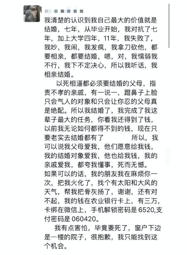 近日,河南省平顶山市鲁山县28岁女教师韦某在婚礼当天死亡的消息引发持续关注和讨论。该小区多位业主向《中国新闻周刊》证实,12月10日上午,一名新娘从高处坠落至一楼一住户的庭院中。警察和救护车到达现场。第二天,尸体被送往殡仪馆。事件发生后,嫌疑人生前发布的一张微信朋友圈截图在网上疯传。多位受访者向《中国新闻周刊》证实,该账号确实是魏某自己的。魏对朋友圈的最后一句话在网上疯传。魏本科时主修历史。 2022年,他以历史岗位笔试第一名、第一名的成绩被聘为鲁山县第一高级中学(以下简称“鲁山一中”)历史教师。st 总分。鲁山一中是河南省示范性高中、全国县域百强高中之一。据受访者透露,在加入鲁山一中之前,魏某曾在县内另一所与鲁山一中合办的民办学校工作。他以前的同事说,魏先生性格温和,深受学生喜爱。有学生家长反映,魏某请假参加婚礼时,正在与学生有说有笑。得知魏老师去世后,孩子们一提到这位老师就哭了。不少学生向《中国新闻周刊》回忆,魏老师性格友善,教学认真负责。一名学生告诉《中国新闻周刊》,魏是他高二时的历史老师。她温柔、美丽,喜欢穿新中式衣服。 “我一直觉得他是一个非常佛系的人。每当我看到“和他在一起,他很随和。”另一名学生林娜(化名)告诉《中国新闻周刊》,高中一年级时,魏每天早上5点50分到学校督促学生早读,最晚到晚上9点10分才下班。当时他教两个班,每个班100多人。“一天少则三四节课,多则六七节课,但他林娜记得,魏老师性格温和但严格,讲课清晰详细,通俗易懂。背书时如果有学生答不上来,就会在一旁坐几分钟。但课后,两天内会要求该学生补考。当时,他的班级整体成绩很差,有的学生没有学习动力,但他从不放弃任何一个学生,不断调整。他的教诲使他的表现保持在年级前列的方法。在林娜眼里,伟热爱生活,喜欢看电视剧、追明星。她上课时妆容自然得体,衣着得体。 “最神奇的是那件粉色的新中式礼服,太神奇了。”与他在学校的形象相反,许多猜测围绕着他的家庭和爱情生活。魏在朋友圈提到:“M在逼我,我的父母不想让我结婚……所以我结婚了,我完成了我一生中最大的任务。”这些内容被一些网友解读为与她的死亡和“逼婚”有关。林娜认为,这条朋友圈表明魏家人并不爱她。 “如果她的家人真的关心她,她就不会在遗言中讽刺地把自己的幸福等同于金钱。他也希望他的朋友能够撒下他的骨灰,他不会忘记家人。”此外,社交平台上也有关于GR的报道。oom的学历、工作造假、负债累累的传闻不少。一位自称与新郎在同一家公司工作的网友告诉《中国新闻周刊》,新郎结婚时至少有本科学历,以鲁山县的收入水平来看,其职位的工资相当高。前述网友还表示,两人并不认识,只是同属一家公司,但办公地点不同。但该公司内部系统显示,新郎的假期为12月8日至12月17日,推测为结婚假期。一名自称新郎同事的人士表示,公司内部系统可以检测到新郎的假期。受访者林娜的照片/提供中还提到,没有一方愿意在秋日收尸。一位知情人告诉《中国新闻周刊》,魏某以在新房换衣服的名义支付了所有费用。发帖后o微信朋友圈中,他纵身一跃,摔进了一楼业主的院子里。业主要求赔偿。女方家人相信她已经结婚了,新郎应该负责。新郎认为自己还没有结婚,应该追究女方的责任。对于相关情况,《中国新闻周刊》12月15日致电鲁山县民政局,工作人员表示不清楚,也没有接到任何通知。鲁山县妇联告诉《中国新闻周刊》,此前并未得到涉事人员的任何帮助,正在关注此事,并已联系县委宣传部进行后续处理。延伸阅读:女教师结婚当天从7楼坠落身亡。村民:客人还没来得及起床,他就跳楼了。近日,网上一则关于河南平顶山市鲁山县一名女高中教师的新闻普罗温斯在婚礼当天从社区一栋大楼坠落,引起了人们的关注。 12月14日,事发小区业主及新娘家乡村民向红星新闻记者证实,女老师在婚礼当天从七楼坠落身亡。家乡村干部告诉红星新闻记者,事发后,村上登门拜访家人,表示慰问并了解情况。 “也许他有抑郁症。”目前,两家人都非常悲伤和愧疚。双方之间没有其他争议,他们表示没有必要进一步干预。事件:婚礼当天,新娘从7楼坠落身亡。他是一名高中老师。 12月14日,事发小区一位业主向红星新闻记者证实,婚礼当天,确实有一名新娘从其小区楼房坠落。业主的据了解,12月10日上午,一名新娘从小区1号楼7楼坠落身亡。业主群上发布的相关照片显示,她的身上盖着一条粉色的被子。当天早上,警车和救护车抵达小区,新娘倒在业主一楼刚装修好的房子客厅外的小院子里。化妆的新娘。图片来源于网络,与内容无关。 “尸体当天没有被带走,直到第二天才被送往殡仪馆。”业主称,他家住的是新建小区,居民以年轻人居多。 “他们买一套婚房是为了结婚,或者买一套房子是为了孩子们读书的地方安家落户。”据他了解,死亡女子是一名高中历史老师,其丈夫职业不明。事发前,该女子曾发布一段疑似“自杀”的文字12月14日中午,一名自称与该女子同村的村民向红星新闻记者证实,该女老师的朋友圈截图是他确实在网上发布的,截图中的名字是坠楼身亡的女子的名字。要结婚了天啊,爬了几分钟就跳了,客人还没爬上去。”该村民称,女孩的老家在乡村。村干部:她可能有抑郁症。