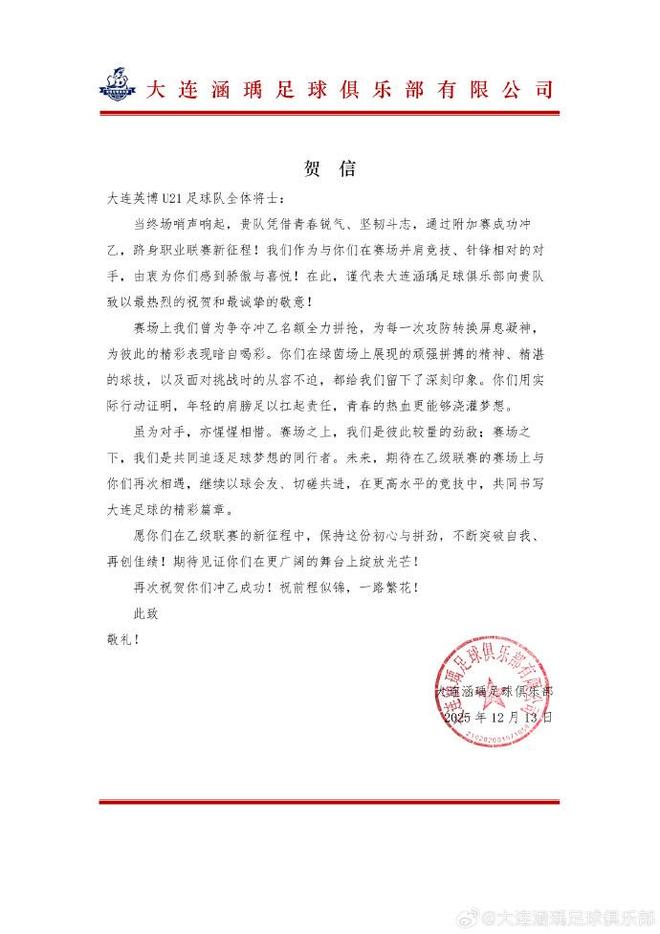 在中冠联赛/U21联赛附加赛晋级赛中,大连英博U21队以2比0战胜同城死敌大连羽宇,获得下赛季中乙联赛参赛资格。今天,对手大连羽宇发来贺信。致大连英博U21足球队全体队员的贺信:当终场哨声吹响时,你们的球队凭借年轻的力量和坚韧的力量,通过附加赛成功晋级第二级别,进入职业联赛的新征程!作为并肩竞争、针锋相对的对手,我们由衷地为你们感到骄傲和高兴!在此,我谨代表大连汉宇足球俱乐部向你们的球队致以最热烈的问候和最诚挚的敬意!赛场上,我们为争夺第二名而奋力拼搏,每一个攻防动作都屏住呼吸,暗暗为对方的精彩表现喝彩。激烈的斗志,精湛的球技让你你们在绿茵场上的表现,你们面对挑战时的冷静,都给我们留下了深刻的印象。你们用实际行动证明,年轻的肩膀足以担当责任,年轻人的愿望可以是水梦。虽然他们是竞争对手,但他们仍然互相欣赏。在赛场上,我们是激烈的对手;场下,我们是一起追逐足球梦想的旅人。未来,希望在乙级联赛中再次与大家见面,继续与球为友,互相学习,共同在更高水平的比赛中谱写大连足球的精彩篇章。希望你们在乙联赛的新征程中保持这份初心和努力,不断突破自我,取得更多成绩!期待你在更大的舞台上绽放光芒!再次祝贺您取得成功!祝您前程似锦,一路鲜花盛开!此致!大连汉宇足球俱乐部有限公司有限公司 2025 年 12 月 13 日